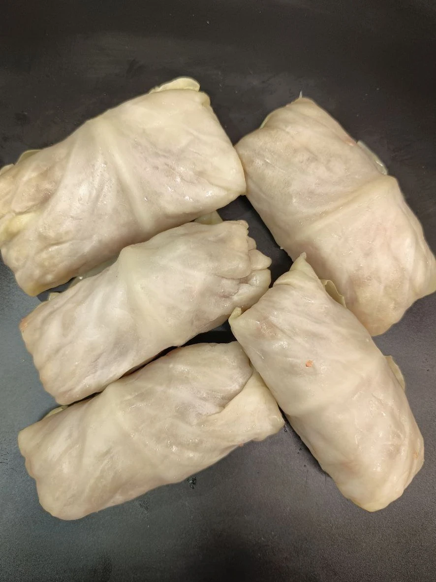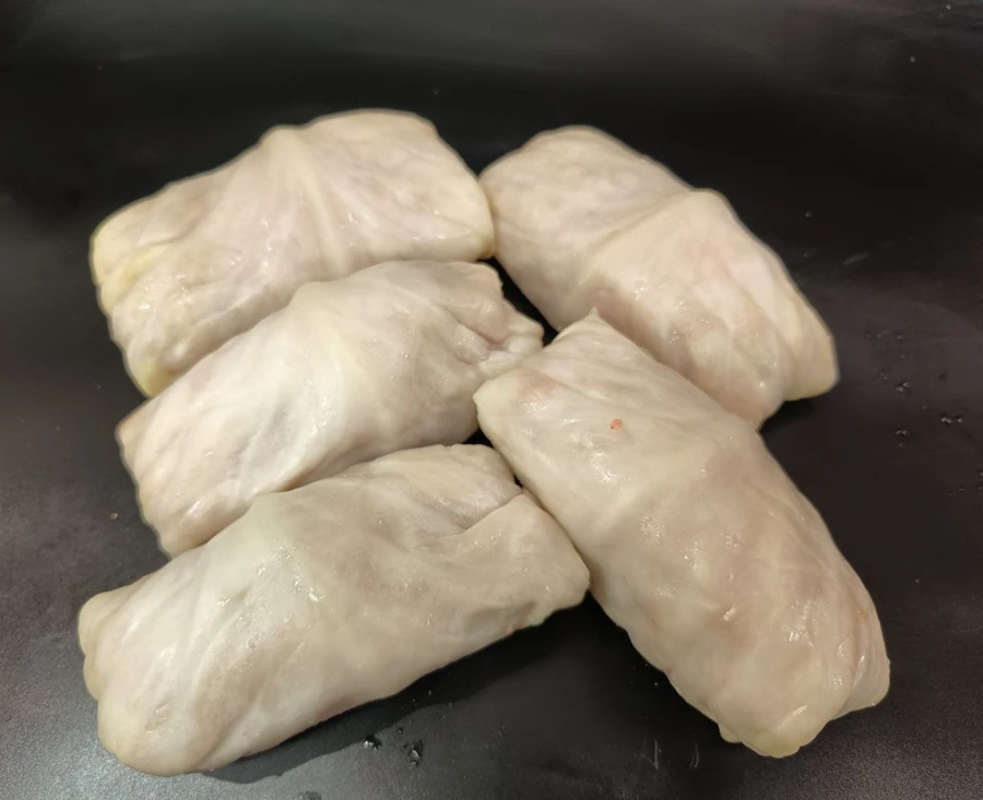 Капустные листья, уже свернутые в голубцы и начинённые смешанным фаршем (говядина/свинина). Получается сытно и по-домашнему: капуста даёт мягкость и сочность, а начинка — насыщенный мясной вкус.