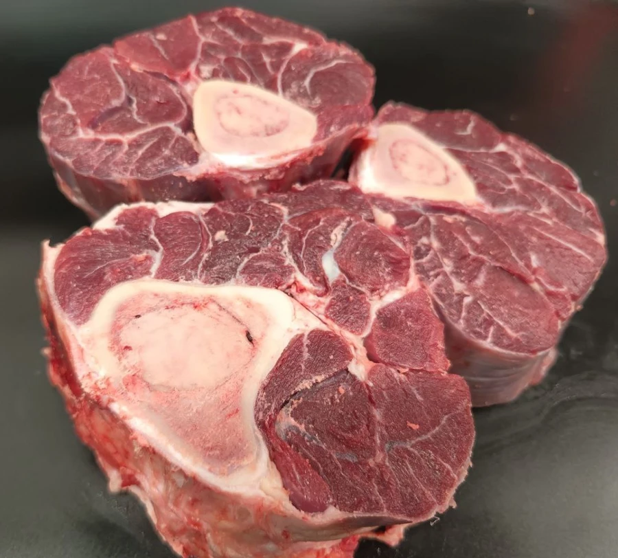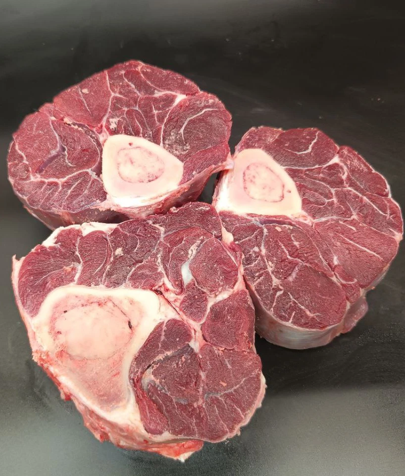 Отруб из голени на кости, богатый коллагеном и костным мозгом — даёт насыщенный, ароматный бульон. Идеален для холодца, супов и блюд длительного приготовления. При медленном тушении мясо становится мягким и хорошо отделяется от кости. Подходит для томления в соусе и рагу до полной нежности.