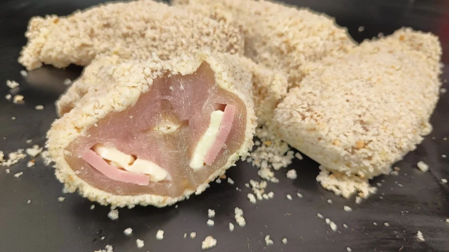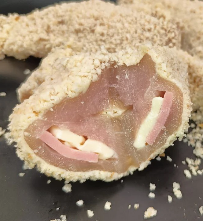 Рулетики из куриного филе с начинкой из ветчины и сыра, уже сформированные и обваленные в панировке. При приготовлении внутри получается нежное сочное мясо, а сыр приятно расплавляется, снаружи — хрустящая корочка.