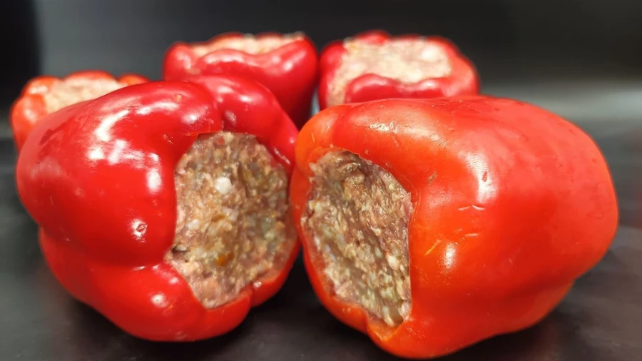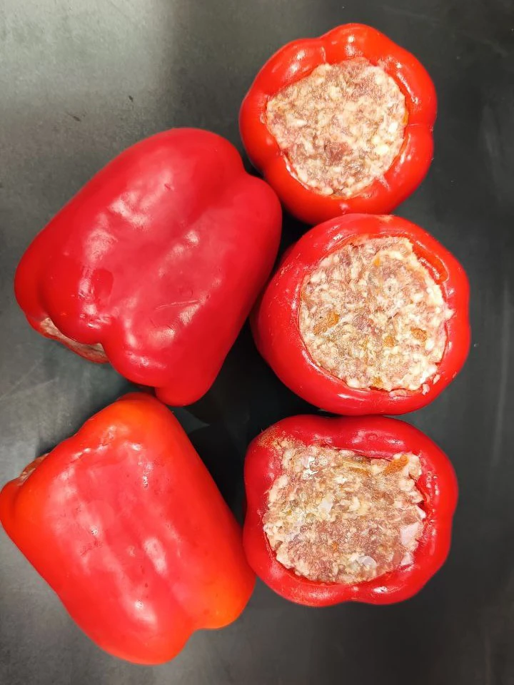 Сладкий болгарский перец, уже начинённый смешанным фаршем (говядина/свинина) и полностью готовый к приготовлению. Перец даёт сочность и лёгкую сладость, а начинка получается сытной и мясной.