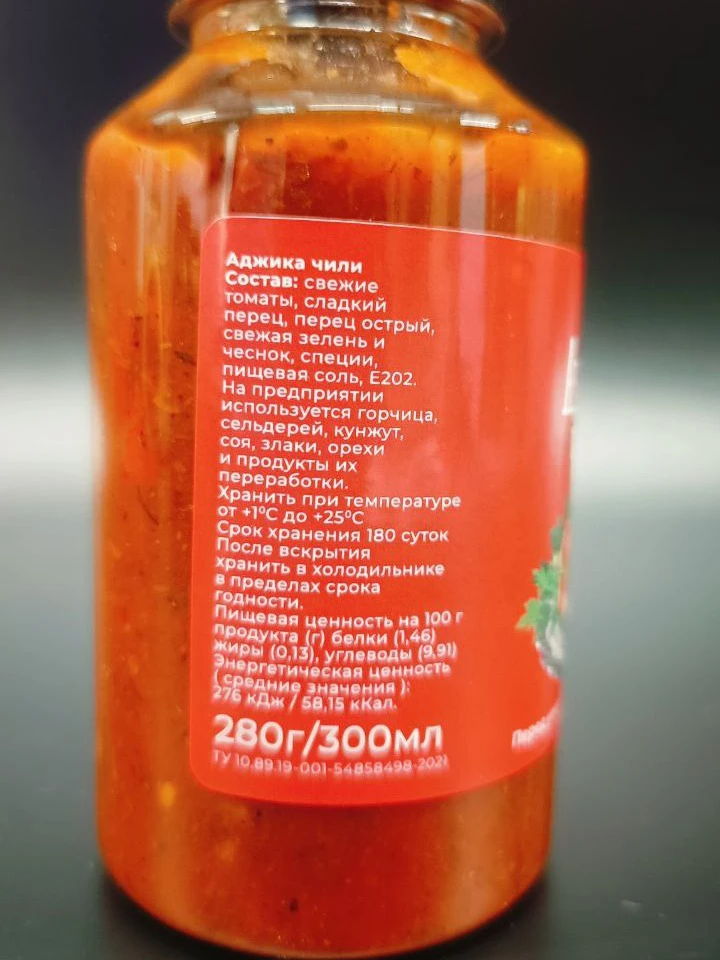 Острый томатный соус в стиле аджики с чили, чесноком и зеленью — яркий, пряный и ароматный. Подходит к мясу на гриле, мангале, запечённой птице и гарнирам, хорошо работает как соус для подачи. Можно добавлять в маринады и тушёные блюда для пикантности. Перед использованием рекомендуется взболтать.